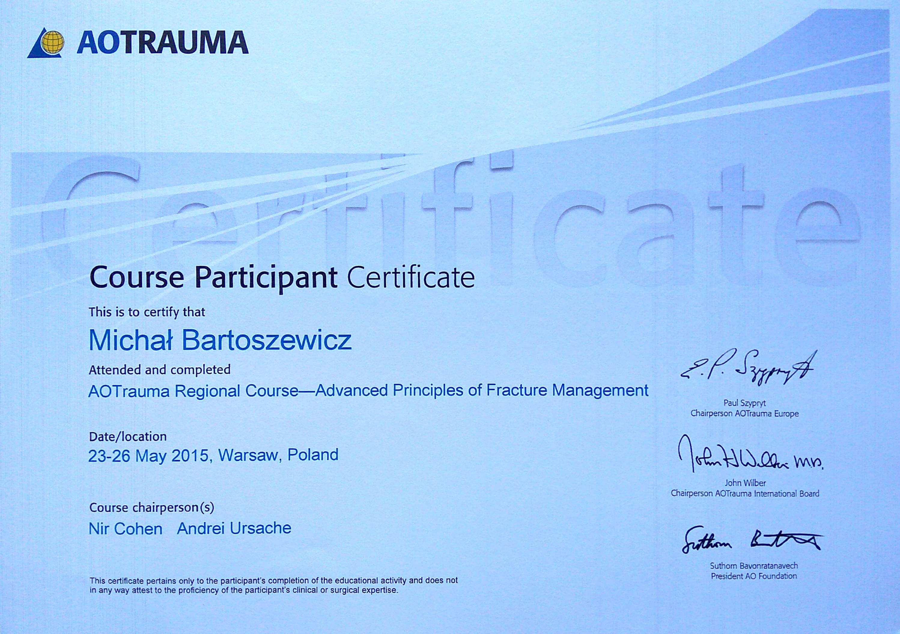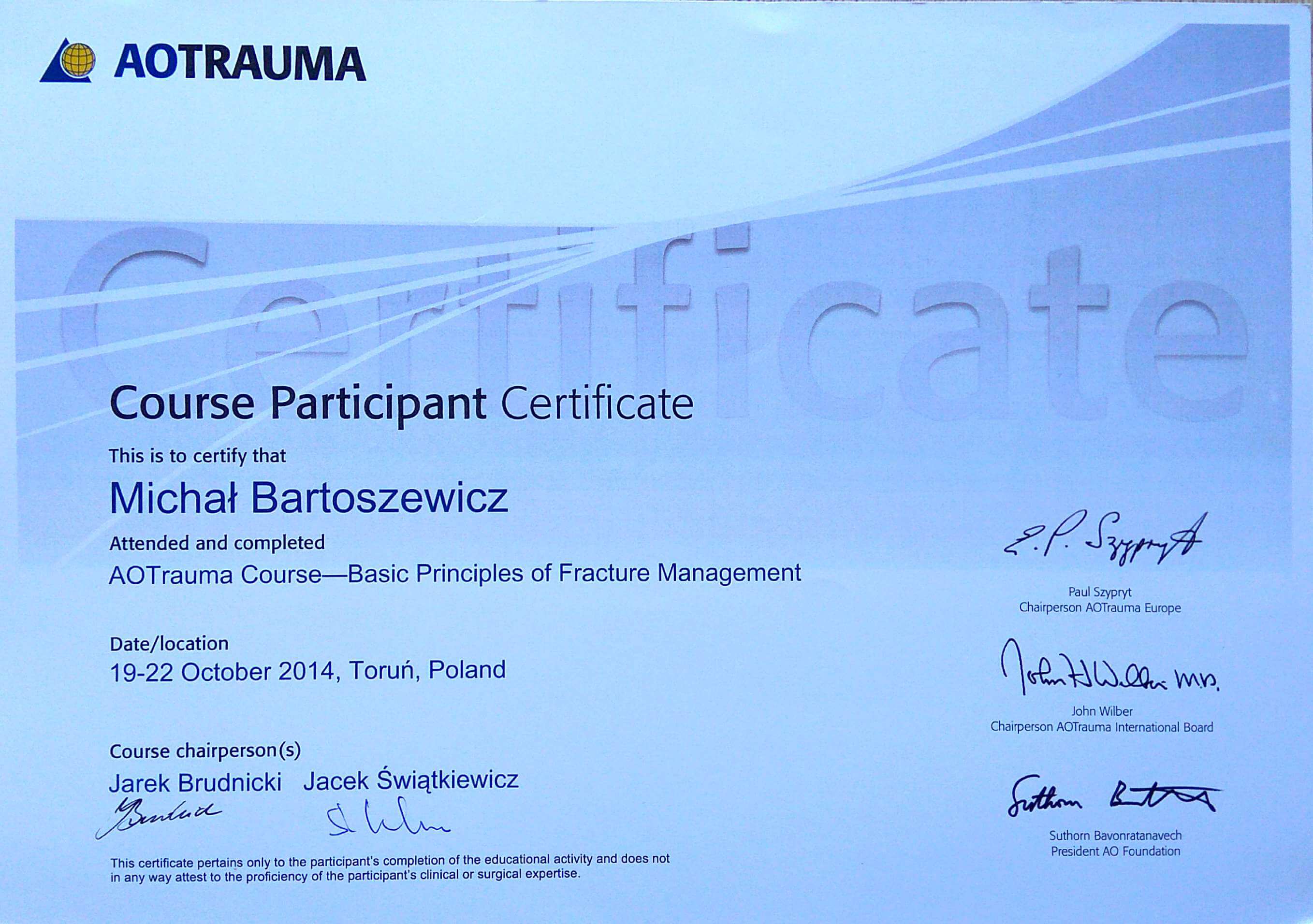 Ukończyłem specjalistyczne szkolenia zagraniczne organizowane przez ESSKA (Europejskie Towarzystwo Traumatologii Sportowej, Chirurgii Kolana i Artroskopii)